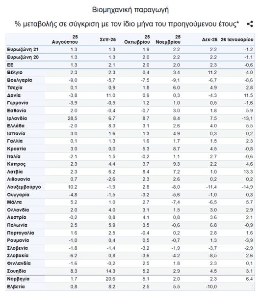 Στη ζώνη του ευρώ τον Ιανουάριο του 2026, σε σύγκριση με τον Ιανουάριο του 2025, η βιομηχανική παραγωγή