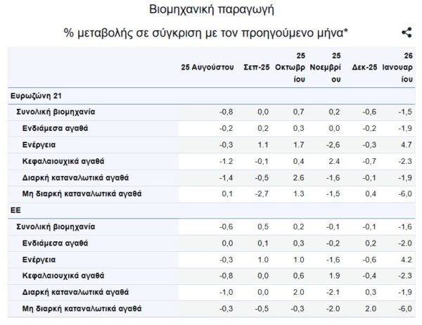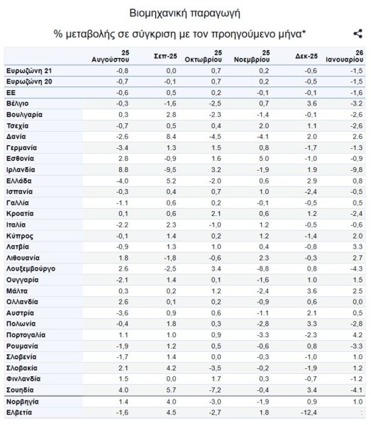 Τον Ιανουάριο του 2026, σε σύγκριση με τον Δεκέμβριο του 2025, η εποχικά διορθωμένη βιομηχανική παραγωγή μειώθηκε κατά 1,5% στη ζώνη του ευρώ και κατά 1,6% στην ΕΕ, ενώ τον Δεκέμβριο του 2025, η βιομηχανική παραγωγή μειώθηκε κατά 0,6% στη ζώνη του ευρώ και κατά 0,1% στην ΕΕ.