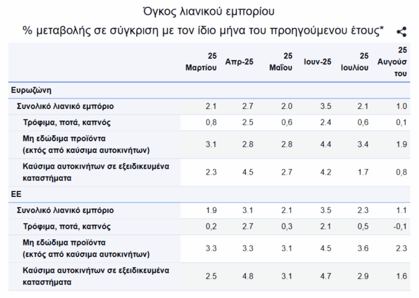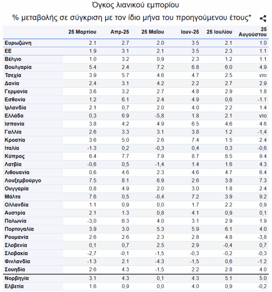 Στη ζώνη του ευρώ τον Αύγουστο του 2025, σε σύγκριση με τον Αύγουστο του 2024, ο όγκος του λιανικού εμπορίου