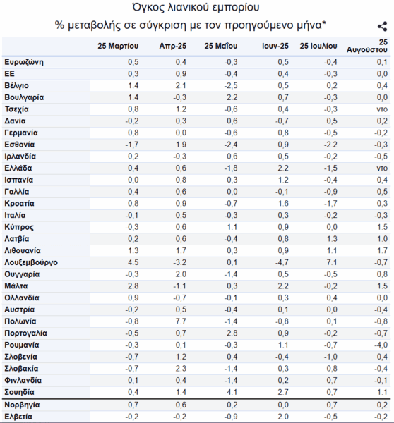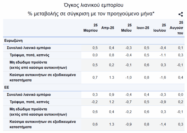 Τον Αύγουστο του 2025, σε σύγκριση με τον Ιούλιο του 2025, ο εποχικά διορθωμένος όγκος λιανικού εμπορίου αυξήθηκε κατά 0,1% στη ζώνη του ευρώ και παρέμεινε σταθερός στην ΕΕ ,ενώ τον Ιούλιο του 2025, ο όγκος λιανικού εμπορίου μειώθηκε κατά 0,4% στη ζώνη του ευρώ και κατά 0,3% στην ΕΕ .