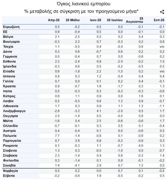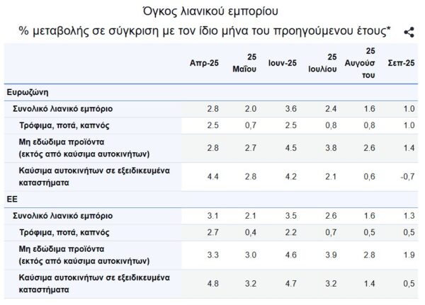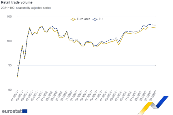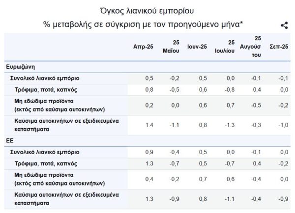 Τον Σεπτέμβριο του 2025, σε σύγκριση με τον Αύγουστο του 2025, ο εποχικά διορθωμένος όγκος λιανικού εμπορίου μειώθηκε κατά 0,1% στη ζώνη του ευρώ και παρέμεινε σταθερός στην ΕΕ, ενώ τον Αύγουστο του 2025, ο όγκος λιανικού εμπορίου μειώθηκε κατά 0,1% τόσο στη ζώνη του ευρώ όσο και στην ΕΕ .