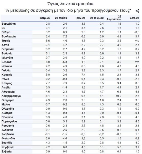 Στη ζώνη του ευρώ τον Σεπτέμβριο του 2025, σε σύγκριση με τον Σεπτέμβριο του 2024, ο όγκος του λιανικού εμπορίου