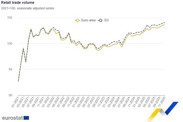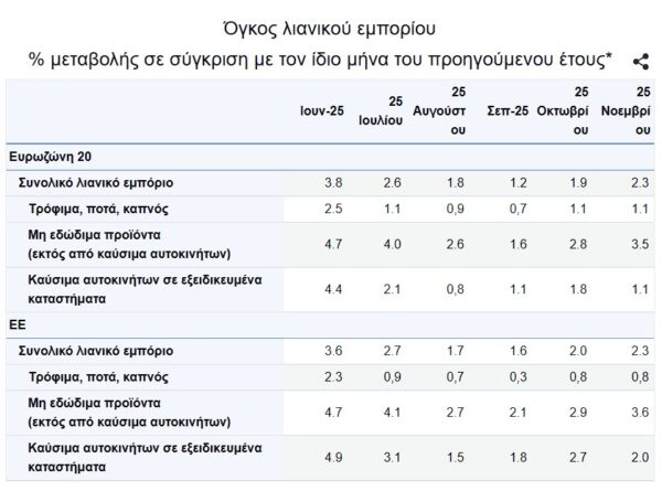 Τον Νοέμβριο του 2025, σε σύγκριση με τον Νοέμβριο του 2024, ο ημερολογιακά προσαρμοσμένος δείκτης λιανικών πωλήσεων αυξήθηκε κατά 2,3% τόσο στη ζώνη του ευρώ όσο και στην ΕΕ, με τις πρώτες εκτιμήσεις της Eurostat για τον μήνα που είναι συνδεδεμένος με τις μεγάλες εκπτώσεις της Black Friday.
