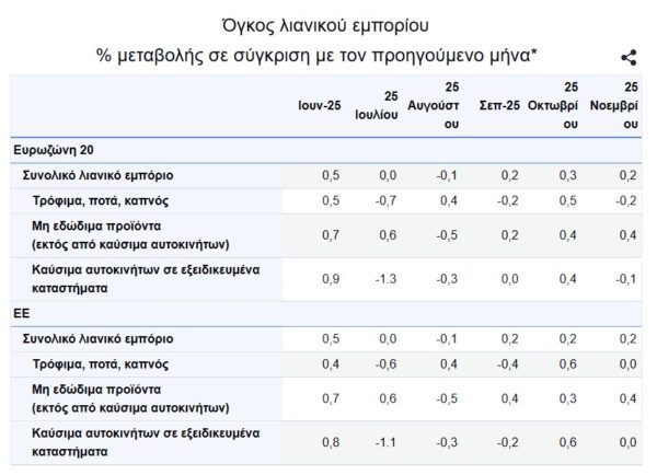 Τον Νοέμβριο του 2025, σε σύγκριση με τον Οκτώβριο του 2025, ο εποχικά διορθωμένος όγκος λιανικού εμπορίου αυξήθηκε κατά 0,2% τόσο στη ζώνη του ευρώ όσο και στην ΕΕ , ενώ τον Οκτώβριο του 2025, ο όγκος λιανικού εμπορίου αυξήθηκε κατά 0,3% στη ζώνη του ευρώ και κατά 0,2% στην ΕΕ .