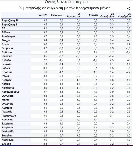 Στη ζώνη του ευρώ τον Νοέμβριο του 2025, σε σύγκριση με τον Οκτώβριο του 2025, ο όγκος του λιανικού εμπορίου