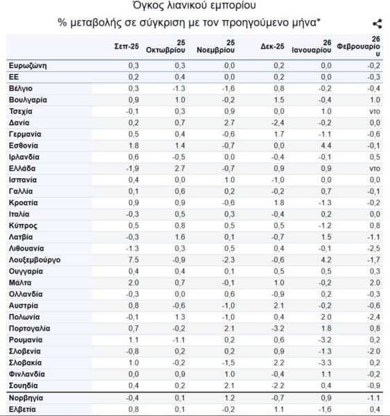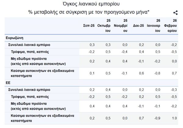 Τον Φεβρουάριο του 2026, σε σύγκριση με τον Ιανουάριο του 2026, ο εποχικά διορθωμένος όγκος λιανικού εμπορίου μειώθηκε κατά 0,2% στη ζώνη του ευρώ και κατά 0,3% στην ΕΕ , σύμφωνα με τις πρώτες εκτιμήσεις της Eurostat.