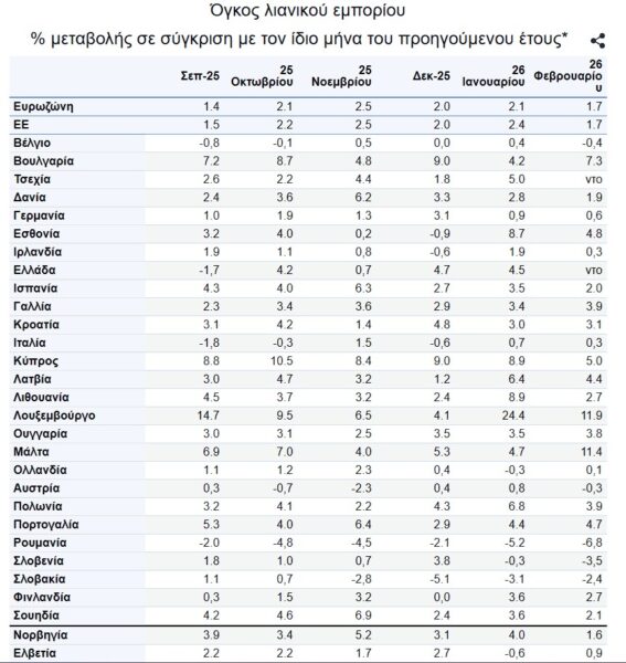 Τον Φεβρουάριο του 2026, σε σύγκριση με τον Φεβρουάριο του 2025, ο ημερολογιακά προσαρμοσμένος δείκτης λιανικών πωλήσεων αυξήθηκε κατά 1,7% τόσο στη ζώνη του ευρώ όσο και στην ΕΕ.