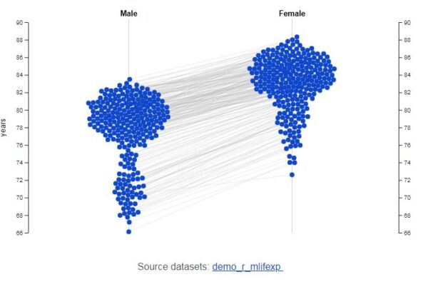 Το υψηλότερο προσδόκιμο ζωής για τους άνδρες, 82,8 χρόνια, βρίσκεται στη νησιωτική περιοχή Åland στη Φινλανδία, ακολουθούμενες από δύο ισπανικές περιοχές – Comunidad de Madrid (82,2 έτη) και Comunidad Foral de Navarra και τη σουηδική περιφέρεια Στοκχόλμης (82, 1 έτος).