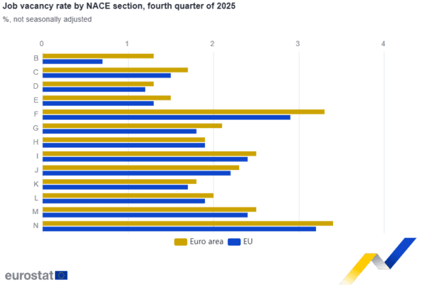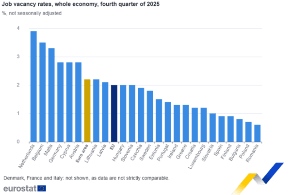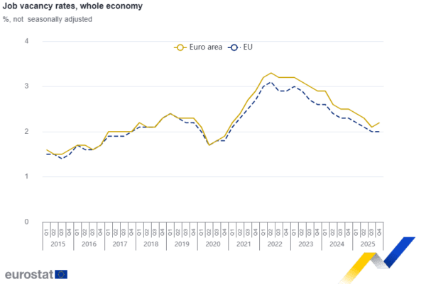 Το δ΄ τρίμηνο του 2025, το ποσοστό κενών θέσεων εργασίας ήταν 2,2% στη ζώνη του ευρώ, αυξημένο από 2,1% το γ΄ τρίμηνο του 2025 και μειωμένο από 2,5% το δ΄ τρίμηνο του 2024, σύμφωνα με τα στοιχεία που δημοσίευσε η Eurostat . Το ποσοστό κενών θέσεων εργασίας στην ΕΕ ήταν 2% το δ΄ τρίμηνο του 2025, αμετάβλητο από το γ΄ τρίμηνο του 2025 και μειωμένο από 2,3% το δ΄ τρίμηνο του 2024.