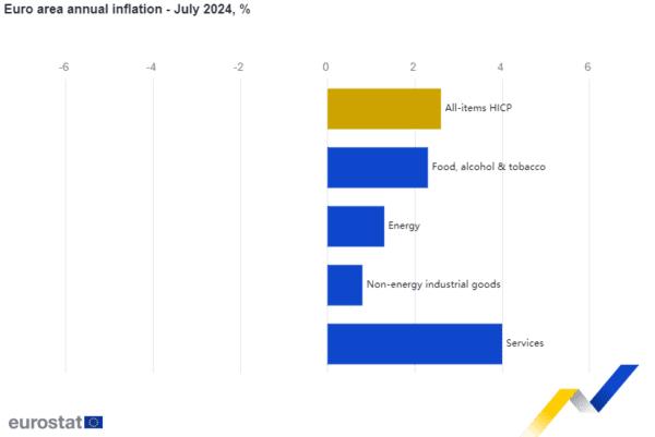 Εξετάζοντας τις κύριες συνιστώσες του πληθωρισμού στη ζώνη του ευρώ, οι υπηρεσίες αναμένεται να έχουν τον υψηλότερο ετήσιο ρυθμό τον Ιούλιο (4,0%, έναντι 4,1% τον Ιούνιο), ακολουθούμενες από τα τρόφιμα, το αλκοόλ και τον καπνό (2,3%, έναντι 2,4% τον Ιούνιο), ενέργεια (1,3%, έναντι 0,2% τον Ιούνιο) και μη ενεργειακά βιομηχανικά αγαθά (0,8%, έναντι 0,7% τον Ιούνιο).