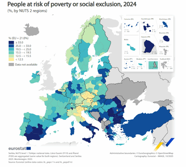 Το 2024, 93 από τις 243 περιφέρειες της ΕΕ (με διαθέσιμα δεδομένα) κατέγραψαν ποσοστά κινδύνου φτώχειας ή κοινωνικού αποκλεισμού υψηλότερα από τον μέσο όρο της ΕΕ (21%). 4 περιφέρειες είχαν το ίδιο ποσοστό, ενώ 146 είχαν χαμηλότερα ποσοστά, σύμφωνα με την Eurostat.