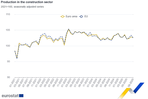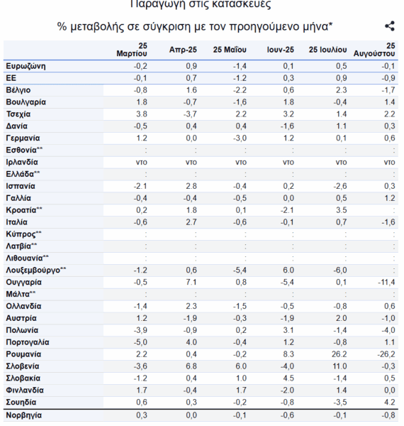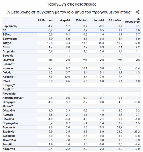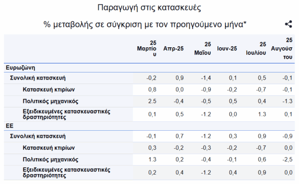 Τον Αύγουστο του 2025, σε σύγκριση με τον Ιούλιο του 2025, η εποχικά προσαρμοσμένη παραγωγή στον κατασκευαστικό τομέα μειώθηκε κατά 0,1% στη ζώνη του ευρώ και κατά 0,9% στην ΕΕ ,ενώ Τον Ιούλιο του 2025, η παραγωγή στον κατασκευαστικό τομέα αυξήθηκε κατά 0,5% στη ζώνη του ευρώ και κατά 0,9% στην ΕΕ.