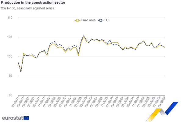 Σχεδόν αμετάβλητη παρέμεινε τον Σεπτέμβριο του 2025 η παραγωγή στις κατασκευές καθώς μειώθηκε οριακά κατά 0,3% στη ζώνη του ευρώ, σε σύγκριση με τον Σεπτέμβριο του 2024, ενώ αντίθετα οριακά αυξήθηκε κατά 0,5% στην ΕΕ, σύμφωνα με τις πρώτες εκτιμήσεις της Eurostat .