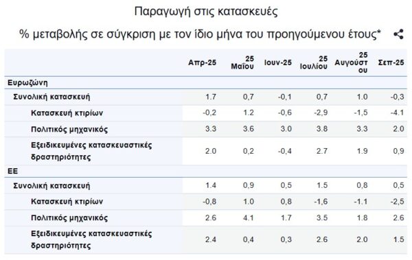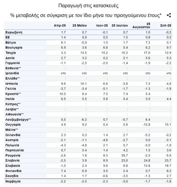 Στη ζώνη του ευρώ τον Σεπτέμβριο του 2025, σε σύγκριση με τον Σεπτέμβριο του 2024, η παραγωγή στις κατασκευές
