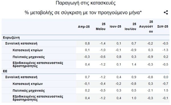 Στη ζώνη του ευρώ τον Σεπτέμβριο του 2025, σε σύγκριση με τον Αύγουστο του 2025, η παραγωγή στις κατασκευές