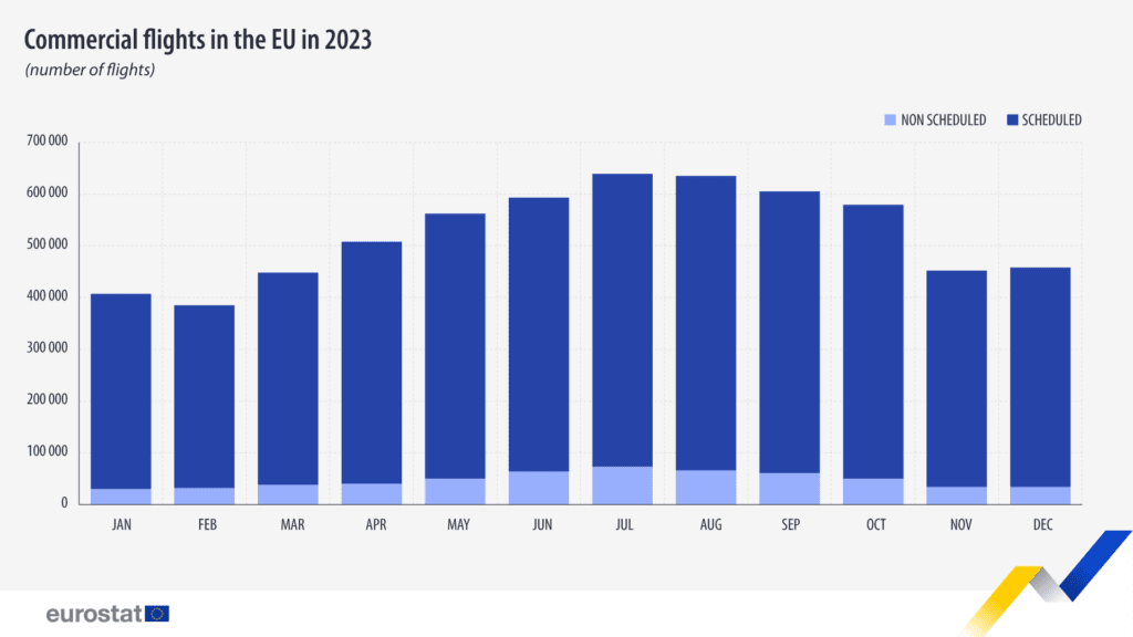 Το 2023, θα πραγματοποιηθούν 6,3 εκατομμύρια εμπορικές πτήσεις στην ΕΕ. Ο αριθμός των πτήσεων παρέμεινε κάτω από τα προ της πανδημίας επίπεδα το 2019 (7,0 εκατομμύρια).