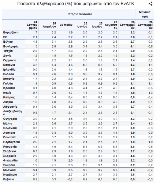 Ο ετήσιος ρυθμός πληθωρισμού στη ζώνη του ευρώ ήταν 2,2 % τον Σεπτέμβριο του 2025 , αυξημένος από 2,0% τον Αύγουστο . Ένα χρόνο νωρίτερα, το ποσοστό ήταν 1,7 %. Ο ετήσιος πληθωρισμός στην Ευρωπαϊκή Ένωση ήταν 2,6 % τον Σεπτέμβριο του 2025 , αυξημένος από 2,4% τον Αύγουστο . Ένα χρόνο νωρίτερα, το ποσοστό ήταν 2,1 %, σύμφωνα με τα στοιχεία που ανακοίνωσε η Eurostat.