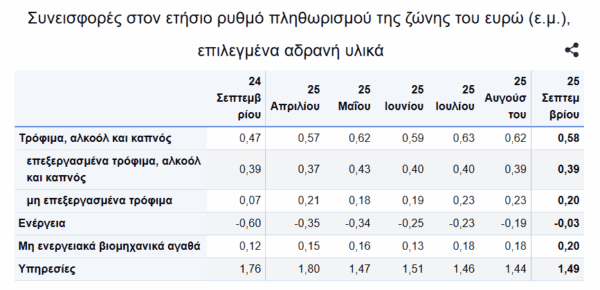 Τον Σεπτέμβριο του 2025 , η μεγαλύτερη συμβολή στον ετήσιο ρυθμό πληθωρισμού της ζώνης του ευρώ προήλθε από τις υπηρεσίες (+1,49 ποσοστιαίες μονάδες, π.μ.), ακολουθούμενες από τα τρόφιμα, το αλκοόλ και τον καπνό (+0,58 π.μ.), τα μη ενεργειακά βιομηχανικά αγαθά (+0,20 π.μ.) και την ενέργεια (-0,03 π.μ.) .