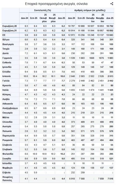- Σε σύγκριση με τον Νοέμβριο του 2025, η ανεργία μειώθηκε κατά 94 χιλιάδες στην ΕΕ και κατά 61 χιλιάδες στη ζώνη του ευρώ .