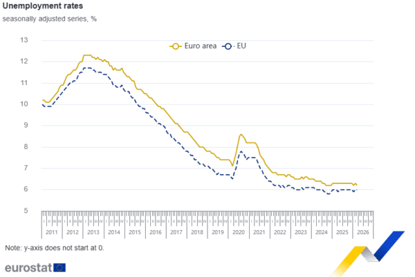 Τον Μάρτιο του 2026, το εποχικά προσαρμοσμένο ποσοστό ανεργίας στη ζώνη του ευρώ ήταν 6,2%, μειωμένο από 6,3% τον Φεβρουάριο του 2026, καθώς και τον Μάρτιο του 2025. Το ποσοστό ανεργίας στην ΕΕ ήταν 6,0% τον Μάρτιο του 2026, σταθερό σε σύγκριση με τον Φεβρουάριο του 2026 και τον Μάρτιο του 2025, σύμφωνα με τα στοιχεία της Eurostat.