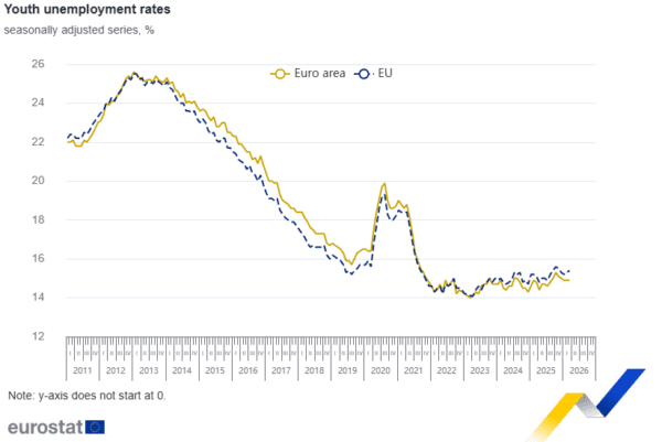 Τον Μάρτιο του 2026, 2,978 εκατομμύρια νέοι (κάτω των 25 ετών) ήταν άνεργοι στην ΕΕ , εκ των οποίων 2,354 εκατομμύρια βρίσκονταν στη ζώνη του ευρώ . Τον Μάρτιο του 2026, το ποσοστό ανεργίας των νέων ήταν 15,4% στην ΕΕ , αυξημένο από 15,3% τον προηγούμενο μήνα και 14,9% στη ζώνη του ευρώ , σταθερό σε σύγκριση με τον Φεβρουάριο του 2026.
