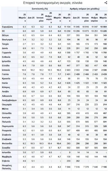 - Σε σύγκριση με τον Φεβρουάριο του 2026, η ανεργία μειώθηκε κατά 25 χιλιάδες στην ΕΕ και κατά 63 χιλιάδες στην ευρωζώνη .