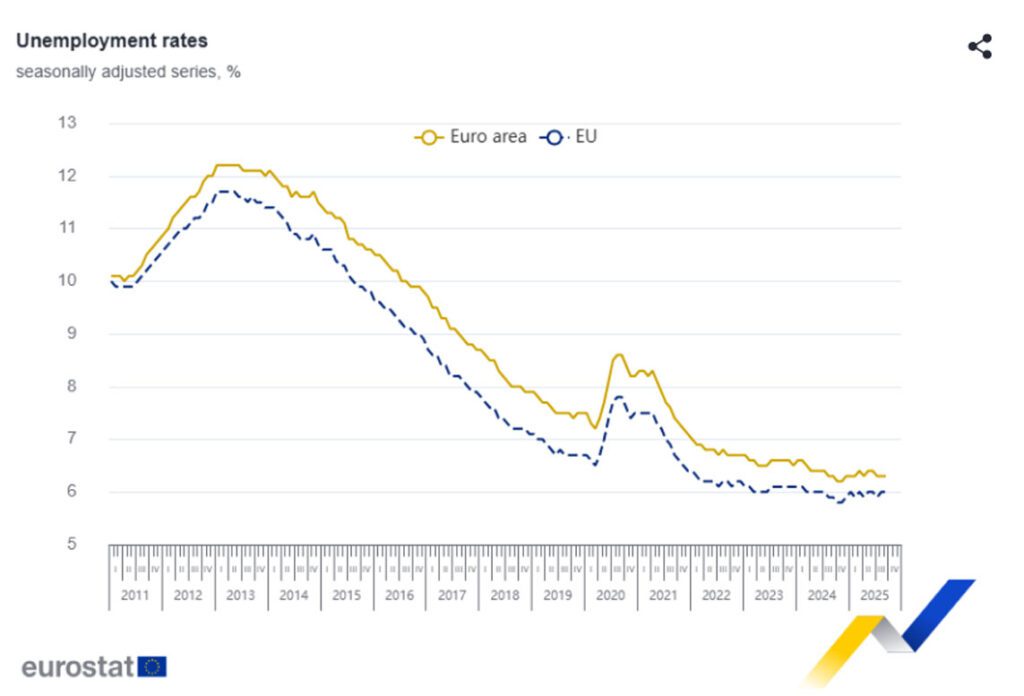 Τον Σεπτέμβριο του 2025, το εποχικά προσαρμοσμένο ποσοστό ανεργίας στην ζώνη του ευρώ ήταν 6,3%, σταθερό σε σύγκριση με τον Αύγουστο του 2025 και τον Σεπτέμβριο του 2024 σύμφωνα με στοιχεία της Eurostat.