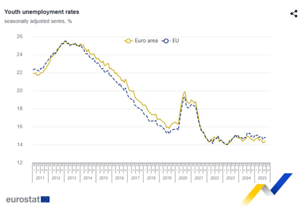 Τον Σεπτέμβριο του 2025, το ποσοστό ανεργίας των νέων ήταν 14,8 % στην ΕΕ, σταθερό σε σύγκριση με τον Αύγουστο του 2025, και 14,4 % στη ζώνη του ευρώ, αυξημένο από 14,3 % τον προηγούμενο μήνα.