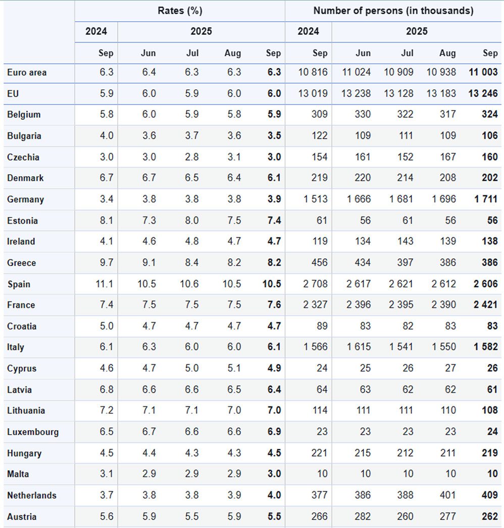 Η Eurostat εκτιμά ότι 13,246 εκατομμύρια άτομα στην ΕΕ, εκ των οποίων 11,003 εκατομμύρια στη ζώνη του ευρώ, ήταν άνεργα τον Σεπτέμβριο του 2025.