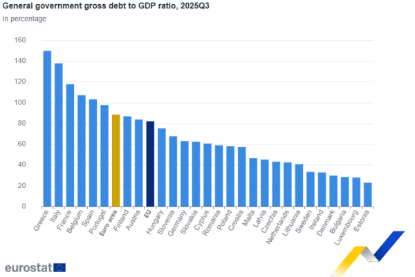 Στο τέλος του γ΄ τριμήνου του 2025, ο λόγος του ακαθάριστου χρέους της γενικής κυβέρνησης προς το ΑΕΠ στη ζώνη του ευρώ (EA20) διαμορφώθηκε σε 88,5%, σημειώνοντας αύξηση σε σύγκριση με 88,2% στο τέλος του β΄ τριμήνου του 2025. Στην ΕΕ , ο λόγος αυξήθηκε επίσης από 81,9% σε 82,1%.