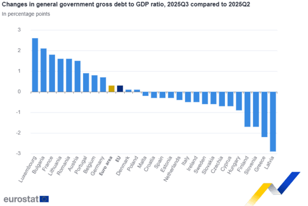 Σε σύγκριση με το δεύτερο τρίμηνο του 2025, έντεκα κράτη μέλη κατέγραψαν αύξηση του λόγου χρέους προς ΑΕΠ στο τέλος του τρίτου τριμήνου του 2025 και δεκαέξι κατέγραψαν μείωση. Οι μεγαλύτερες αυξήσεις του λόγου παρατηρήθηκαν στο Λουξεμβούργο (+2,6 ποσοστιαίες μονάδες – ποσοστιαίες μονάδες), τη Βουλγαρία (+2,1%), τη Γαλλία (+1,8%), τη Λιθουανία και τη Ρουμανία (και οι δύο +1,6%) και την Αυστρία (+1,5%). Οι μεγαλύτερες μειώσεις καταγράφηκαν στη Λετονία (-2,9%), την Ελλάδα (-2,2%), τη Σλοβενία και τη Φινλανδία (και οι δύο -1,7%).