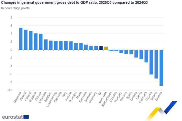 Σε σύγκριση με το τρίτο τρίμηνο του 2024, δεκαέξι κράτη μέλη κατέγραψαν αύξηση του λόγου χρέους προς ΑΕΠ στο τέλος του τρίτου τριμήνου του 2025 και έντεκα κράτη μέλη κατέγραψαν μείωση. Οι μεγαλύτερες αυξήσεις του λόγου καταγράφηκαν στη Ρουμανία (+5,5%), την Πολωνία (+5%), τη Φινλανδία (+4,7 %), τη Βουλγαρία (+4,1%) και τη Γαλλία (+4%). Οι μεγαλύτερες μειώσεις παρατηρήθηκαν στην Ελλάδα (-8,9%), την Ιρλανδία (-7,1%), την Κύπρο (-6,1%), τη Δανία (-3,1%) και τη Λετονία (-2,3%).