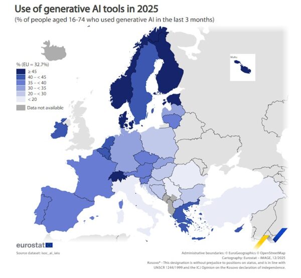 Το 2025, το 32,7% των ατόμων ηλικίας 16-74 ετών στην ΕΕ χρησιμοποίησε εργαλεία γενετικής τεχνητής νοημοσύνης (ΤΝ), σύμφωνα την Eurostat. Οι περισσότεροι άνθρωποι τα χρησιμοποίησαν για προσωπικούς σκοπούς (25,1%), ενώ το 15,1% τα χρησιμοποίησε για εργασία και το 9,4% για επίσημη εκπαίδευση.