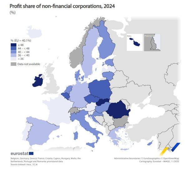 Μεταξύ των χωρών της ΕΕ, οι υψηλότερες τιμές μεριδίου κέρδους το 2024 σημειώθηκαν στην Ιρλανδία (74,9%), τη Μάλτα (56,4%) και τη Σλοβακία (48,9%). Η υψηλή αξία της Ιρλανδίας μπορεί να αποδοθεί στις μεγάλες πολυεθνικές εταιρείες ξένης ιδιοκτησίας που βρίσκονται στη χώρα, οι οποίες έχουν υψηλή ένταση κεφαλαίου.