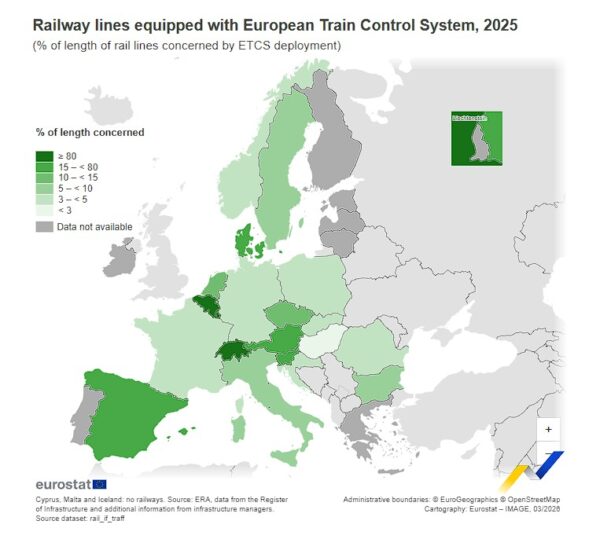 Το Ευρωπαϊκό Σύστημα Ελέγχου Τρένων (ETCS) αποτελεί ένα αποτελεσματικό μέτρο ασφαλείας για τη μείωση των κινδύνων σύγκρουσης τρένων μέσω σημάτων που βασίζονται σε γραμμές ή ραδιοσήματα. Το 2025, σύμφωνα με τον Οργανισμό Σιδηροδρόμων της Ευρωπαϊκής Ένωσης (ERA), το Λουξεμβούργο ήταν η μόνη χώρα που ήταν πλήρως εξοπλισμένη με ETCS, μπροστά από το Βέλγιο (90,3% των σιδηροδρομικών γραμμών του) και τη Δανία (51,6%), ενώ οι λιγότερο εξοπλισμένες χώρες ήταν η Ουγγαρία (1,6%), η Κροατία (3,0%) και η Γερμανία και η Ρουμανία (και οι δύο 3,2%).