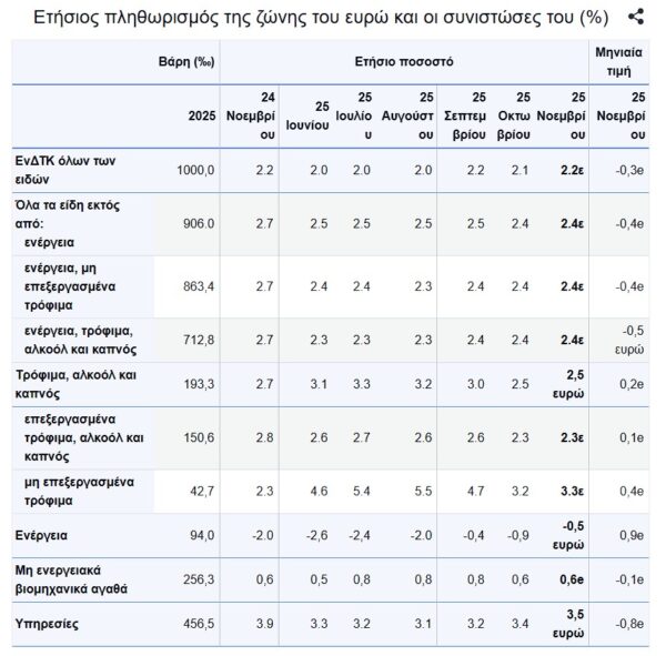 Απότομη άνοδος στο 2,9% του πληθωρισμού (Εναρμονισμένο Δείκτης Τιμών Καταναλωτή) στην Ελλάδα καταγράφουν τα προκαταρκτικά στοιχεία της Eurostat για τον Νοέμβριο του 2025, έπειτα από δύο μήνες έντονης επιβράδυνσης των ανατιμήσεων (1,6% τον Οκτώβριο και 1,8% τον Σεπτέμβριο) και σχεδόν «επιστροφή» στον πληθωρισμό Νοεμβρίου 2024 (3%).