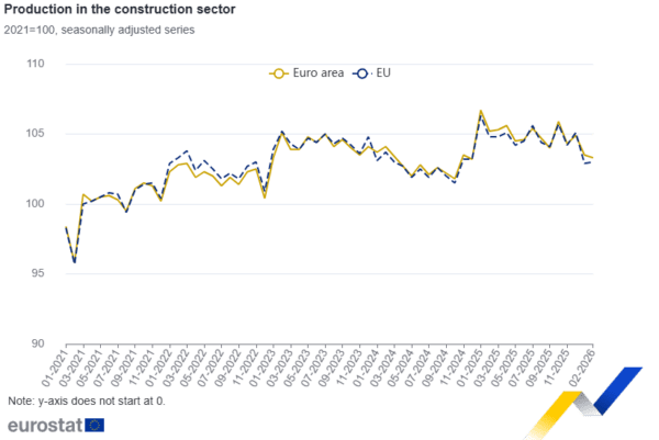 Τον Φεβρουάριο του 2026, σε σύγκριση με τον Ιανουάριο του 2026, η εποχικά προσαρμοσμένη παραγωγή στον κατασκευαστικό τομέα μειώθηκε οριακά κατά 0,2% στη ζώνη του ευρώ ενώ αυξήθηκε επίσης οριακά κατά 0,1% στην ΕΕ. Τον Ιανουάριο του 2026, η παραγωγή στον κατασκευαστικό τομέα μειώθηκε κατά 1,3% στη ζώνη του ευρώ και κατά 2,1% στην ΕΕ .