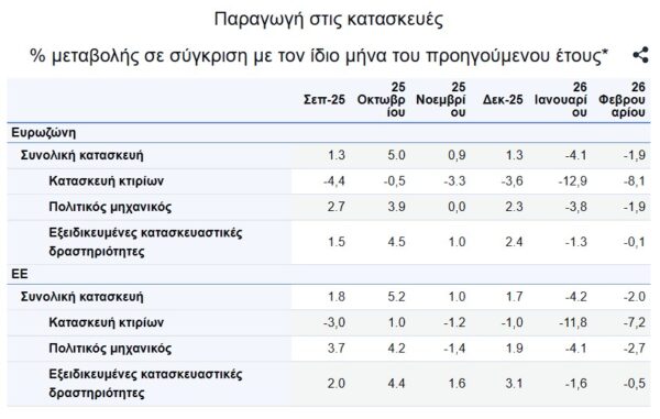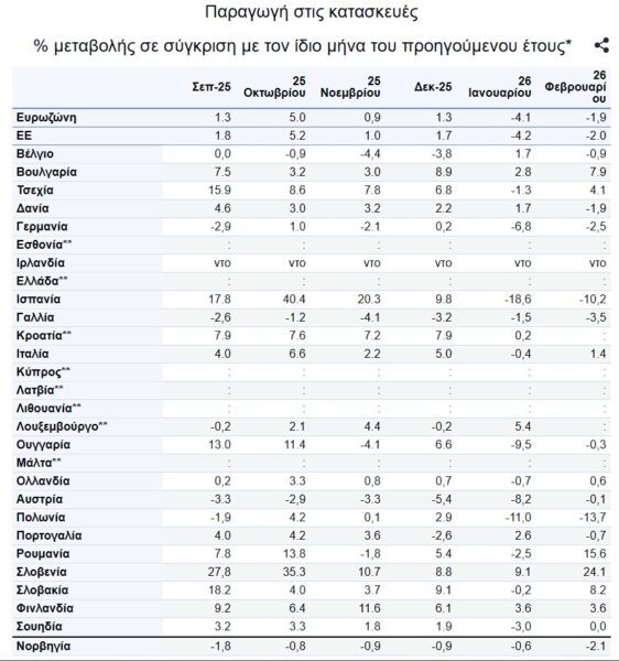 Στη ζώνη του ευρώ τον Φεβρουάριο του 2026, σε σύγκριση με τον Φεβρουάριο του 2025, η παραγωγή στις κατασκευές