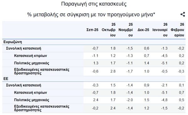 Στη ζώνη του ευρώ τον Φεβρουάριο του 2026, σε σύγκριση με τον Ιανουάριο του 2026, η παραγωγή στις κατασκευές