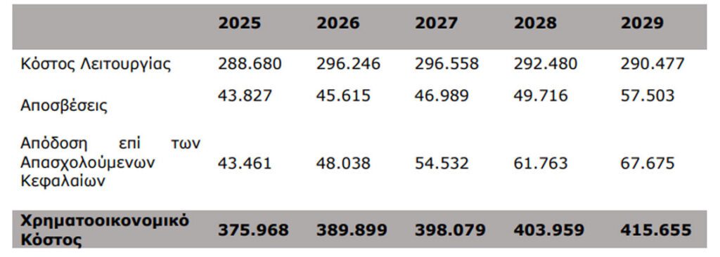 Το ανωτέρω συνολικό εγκεκριμένο χρηματοοικονομικό κόστος για όλη τη ρυθμιστική περίοδο 2025-2029 θα ανακτηθεί με το τιμολόγιο που θα τεθεί σε ισχύ από 1/1/2026 μέχρι τις 31/12/2029.