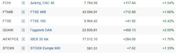 Ο πανευρωπαϊκός δείκτης Stoxx 600 σημείωσε άνοδο 1,4% στις 581.01 μονάδες, έχοντας διαπραγματευτεί σχεδόν 2% χαμηλότερα νωρίτερα στη συνεδρίαση, με τα μεγάλα χρηματιστήρια και τους περισσότερους κλάδους να εκτοξεύονται σε θετικό έδαφος.
