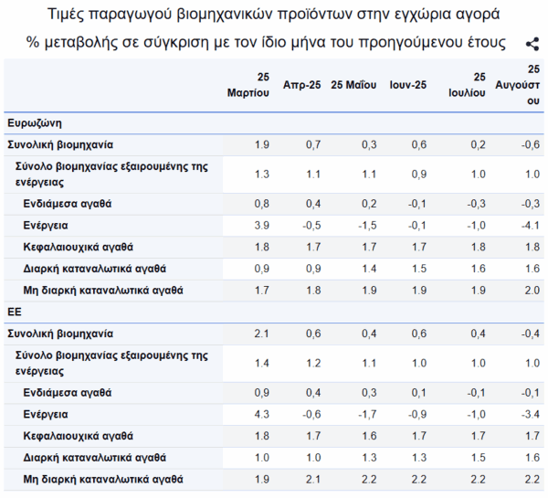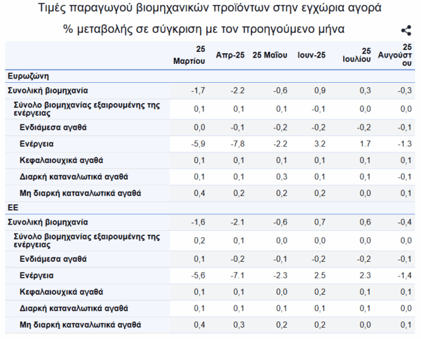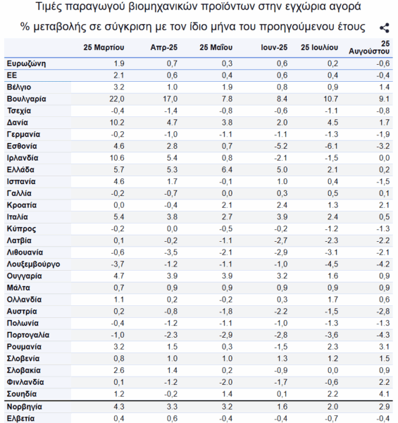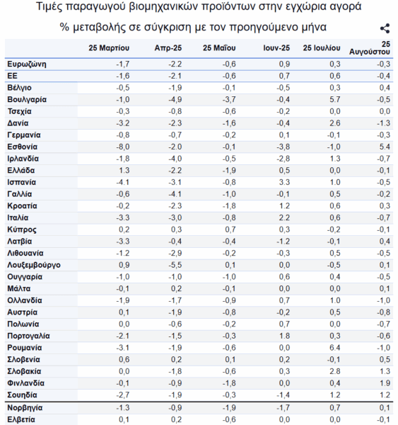 Στη ζώνη του ευρώ τον Αύγουστο του 2025, σε σύγκριση με τον Αύγουστο του 2024, οι τιμές παραγωγού βιομηχανικών προϊόντων