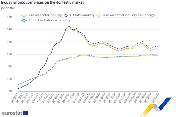 Τον Αύγουστο του 2025, σε σύγκριση με τον Αύγουστο του 2024, οι τιμές παραγωγού βιομηχανικών προϊόντων μειώθηκαν οριακά κατά 0,6% στη ζώνη του ευρώ και κατά 0,4% στην ΕΕ , σύμφωνα με τις πρώτες εκτιμήσεις της Eurostat.