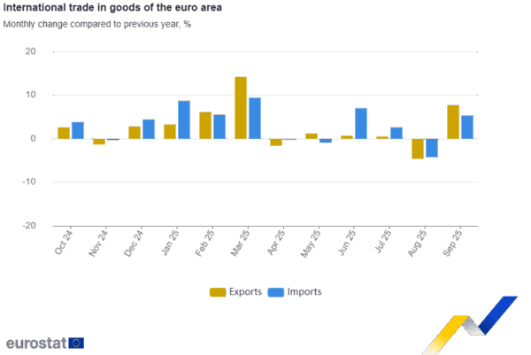Την περίοδο Ιουλίου-Σεπτεμβρίου 2025, οι εξαγωγές της ζώνης του ευρώ προς χώρες εκτός Ευρωζώνης μειώθηκαν κατά 0,2%, ενώ οι εισαγωγές μειώθηκαν κατά 0,7%. Το εμπόριο εντός της ζώνης του ευρώ αυξήθηκε κατά 0,9%. Κατά την ίδια περίοδο, οι εξαγωγές της ΕΕ προς χώρες εκτός ΕΕ μειώθηκαν κατά 0,8%, ενώ οι εισαγωγές μειώθηκαν κατά 1,3%. Το εμπόριο εντός της ΕΕ αυξήθηκε κατά 0,8%.