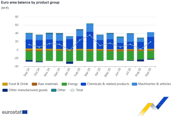 Τον Σεπτέμβριο του 2025, το ισοζύγιο της ζώνης του ευρώ παρουσίασε σημαντική βελτίωση σε σύγκριση με τον Αύγουστο του 2025, με το συνολικό πλεόνασμα να αυξάνεται από 1,9 δισ. ευρώ σε 19,4 δισ. ευρώ. Αυτή η αξιοσημείωτη αύξηση οφείλεται κυρίως στη σημαντική αύξηση του πλεονάσματος των χημικών προϊόντων, το οποίο αυξήθηκε από 17,9 δισ. ευρώ τον Αύγουστο του 2025 σε 29,1 δισ. ευρώ τον Σεπτέμβριο του 2025.
