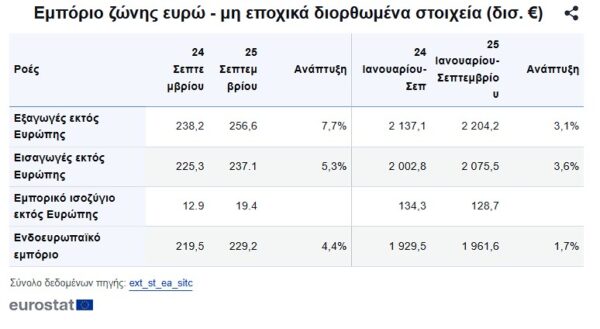 Οι εξαγωγές αγαθών εκτός ΕΕ αυξήθηκαν στα 1.986,7 δισ. ευρώ (αύξηση 3,0% σε σύγκριση με τον Ιανουάριο-Σεπτέμβριο του 2024) και οι εισαγωγές αυξήθηκαν στα 1.882,4 δισ. ευρώ (αύξηση 3,6% σε σύγκριση με τον Ιανουάριο-Σεπτέμβριο του 2024).