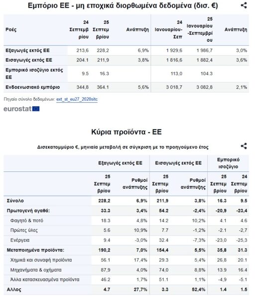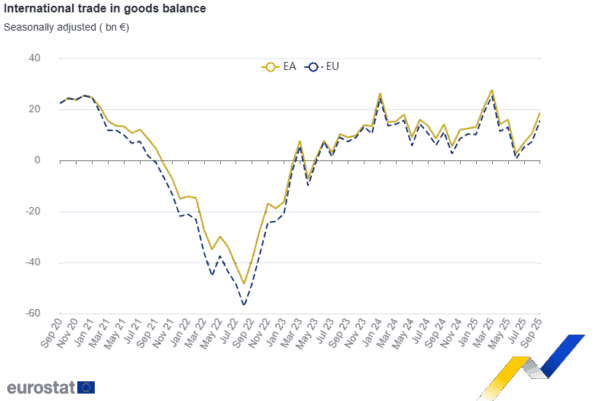 Το ισοζύγιο της ΕΕ παρουσίασε πλεόνασμα 16,3 δισ. ευρώ στο εμπόριο αγαθών με τον υπόλοιπο κόσμο τον Σεπτέμβριο του 2025, σε σύγκριση με +9,5 δισ. ευρώ τον Σεπτέμβριο του 2024.