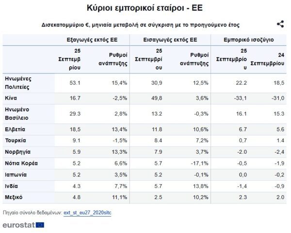 Από τον Ιανουάριο έως τον Σεπτέμβριο του 2025, η ΕΕ κατέγραψε πλεόνασμα 104,3 δισ. ευρώ, σε σύγκριση με 113,0 δισ. ευρώ τον Ιανουάριο-Σεπτέμβριο του 2024.