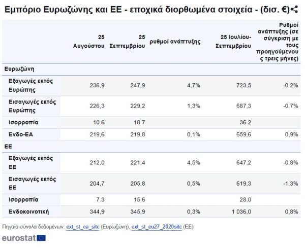 Οι πρώτες εκτιμήσεις του ισοζυγίου της ζώνης του ευρώ έδειξαν πλεόνασμα 19,4 δισ. ευρώ στο εμπόριο αγαθών με τον υπόλοιπο κόσμο τον Σεπτέμβριο του 2025, σε σύγκριση με + 12,9 δισ. ευρώ τον Σεπτέμβριο του 2024, σύμφωνα με την Eurostat.