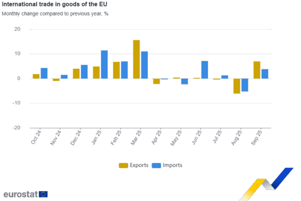 Τον Σεπτέμβριο του 2025, σε σύγκριση με τον Αύγουστο του 2025, οι εποχικά προσαρμοσμένες εξαγωγές της ΕΕ αυξήθηκαν κατά 4,5%, ενώ οι εισαγωγές αυξήθηκαν κατά 0,5%. Το εποχικά προσαρμοσμένο ισοζύγιο ανήλθε σε 15,6 δισ. ευρώ, σημειώνοντας αύξηση σε σύγκριση με τον Αύγουστο (7,3 δισ. ευρώ).